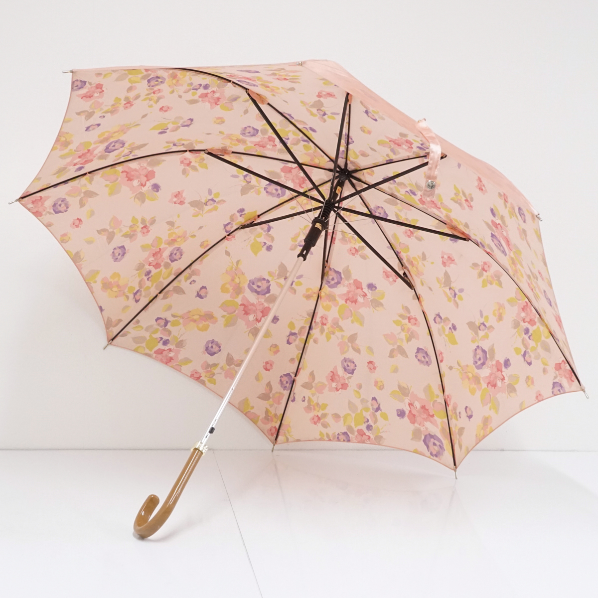 > 耐風傘 CHARLES JOURDAN シャルルジョルダン USED美品 ピンク バックフラワー 水彩風 花柄 ジャンプ グラス骨 丈夫 60cm A1819