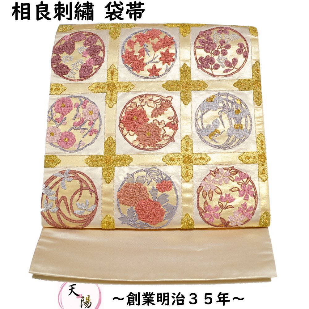 - 袋帯 相良刺繍 未使用品 天井格子に春秋草花模様 金通し 金糸 リサイクル 帯 正絹 中古 リサイクル着物 フォーマル 着物 きもの天陽