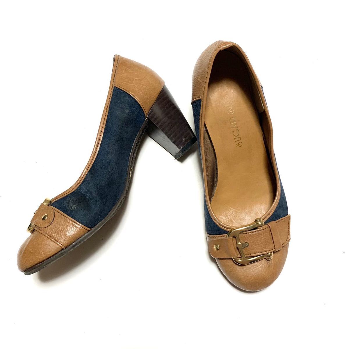 > レザー調スエードベルトパンプス 23.0 ネイビーバイカラー シュガーシュガー sugarsugar 起毛 ピーチスキン 紺 ベージュ ヒール
