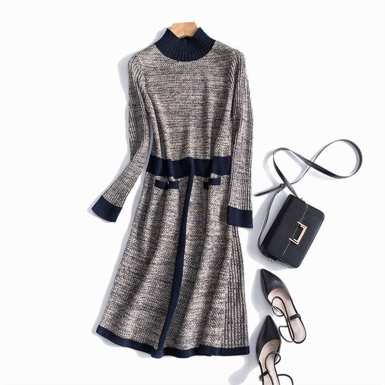 - ゴールドシルクウールワンピース トックリセーター 膝丈スカート ロングワンピース ウールスカート長袖高級感