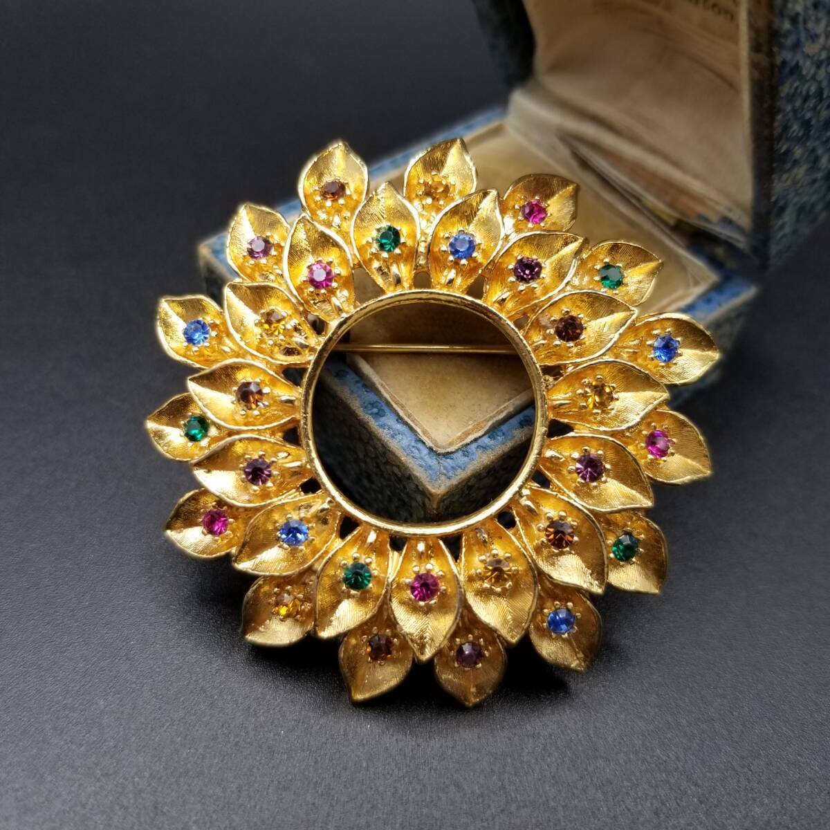 > ゴールドのお花 リースフレーム ヴィンテージ フラワー ブローチ ラインストーン装飾 レトロ ゴールドトーン 存在感 Y20-C