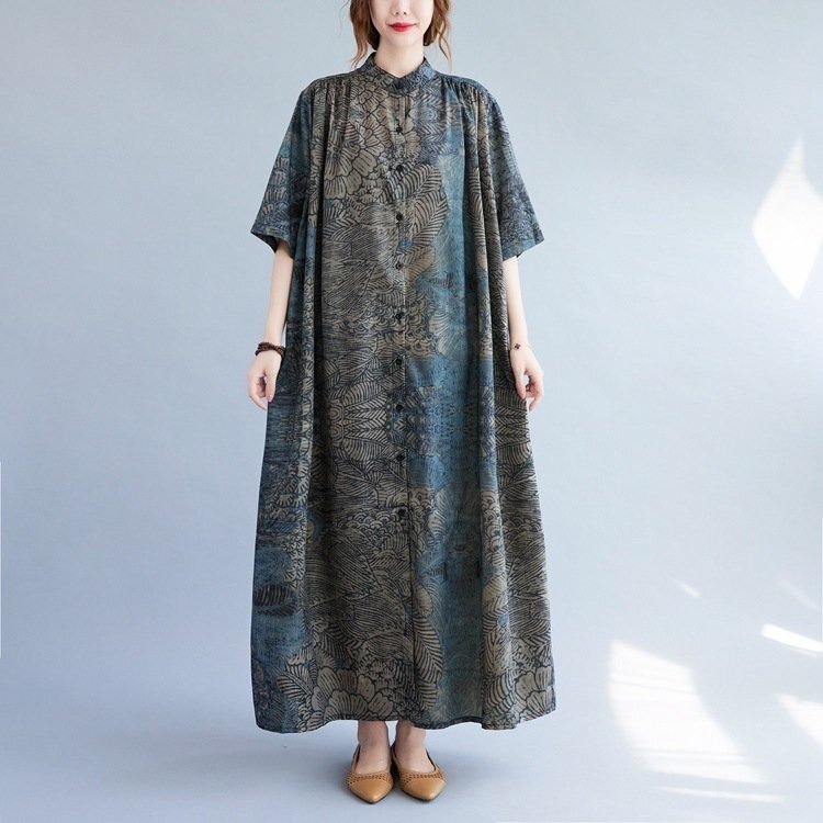 - 着回し半袖 マキシロング シャツワンピース 20~50代 オシャレ プリント柄 ゆったり 大きいサイズ 半袖 シャツワンピース ZCL470