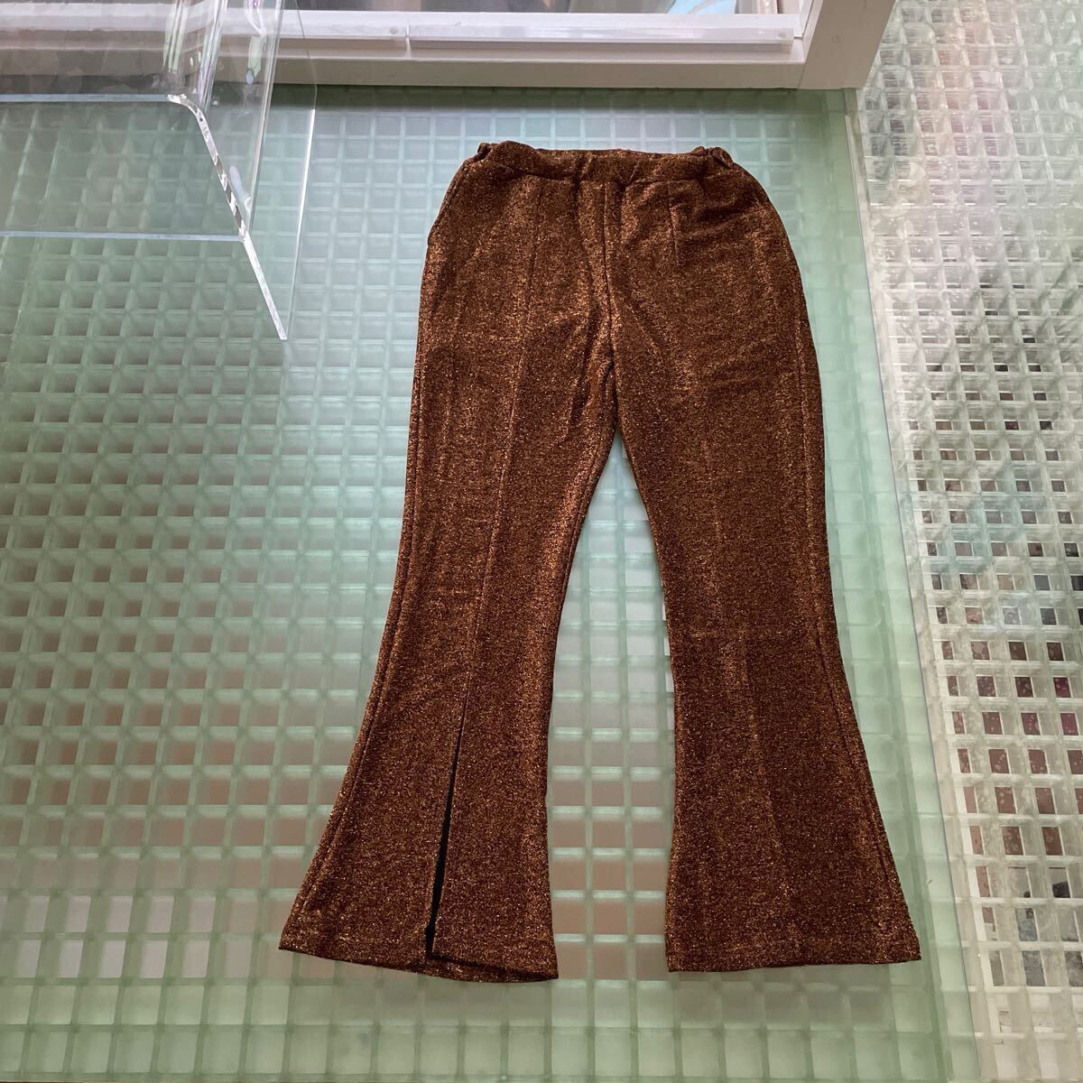 - ブラウン ラメ スリットパンツ 昭和レトロ フレアパンツ ベルボトム グリッター パンツ スラックス