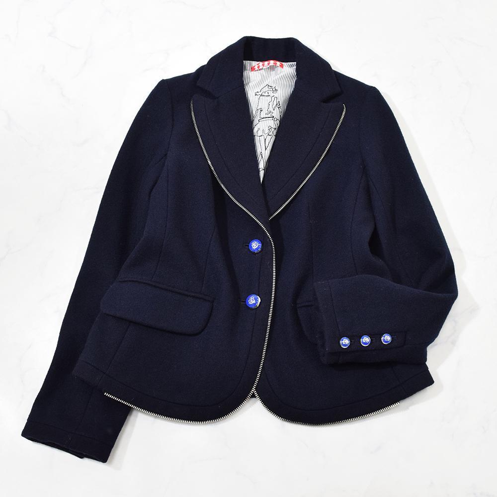 - 美品 ピッコーネ PICONE ロゴ釦 ジップ ファスナー飾り メルトンウール ジャケット 40 ネイビー 裏地刺繍入り