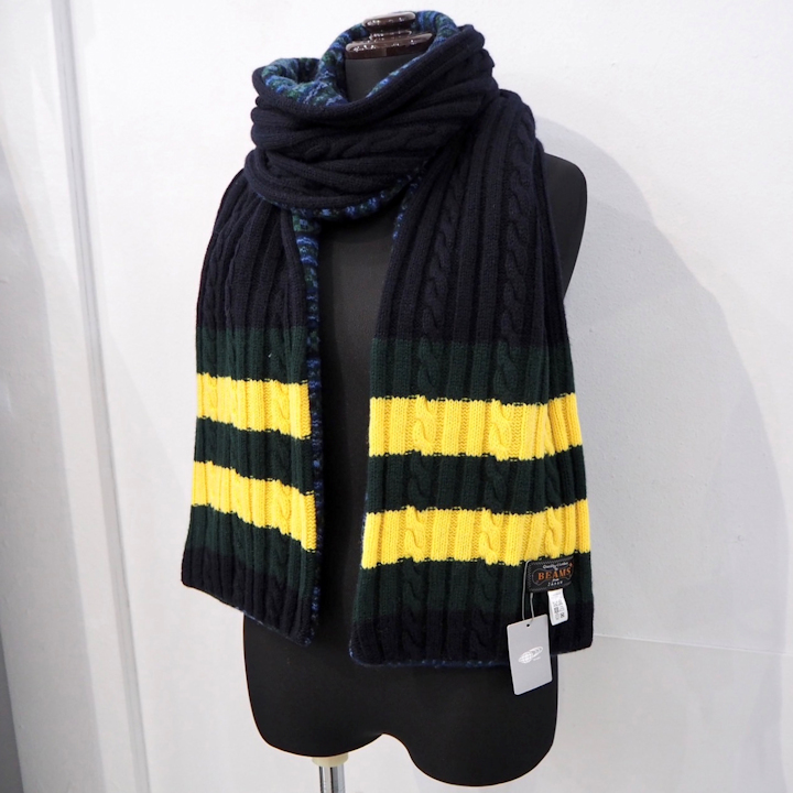 > 新品 定価22000円 ビームス スコットランド製 上質ニット リバーシブル マフラー 紺 ネイビー 緑 黄色 メンズ ケーブル BEAMS プレゼント