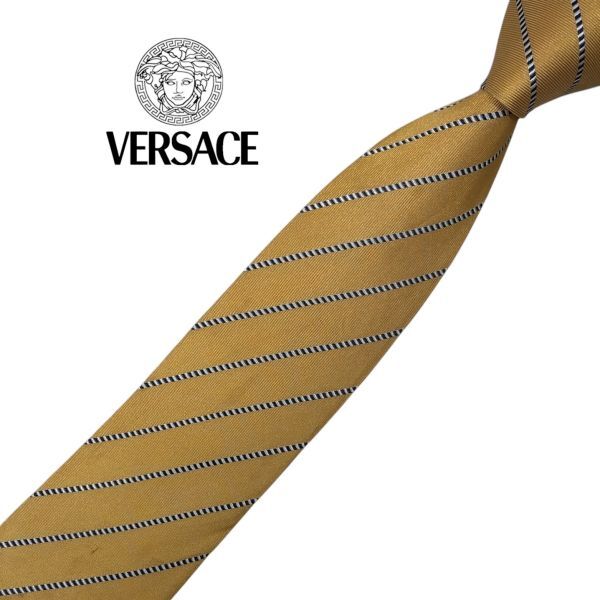 > ★ナロータイ★メデューサ★ストライプ柄★VERSACE★高級ネクタイ イエローベージュ系 ヴェルサーチェ シルク USED プレス済み ネコポス可