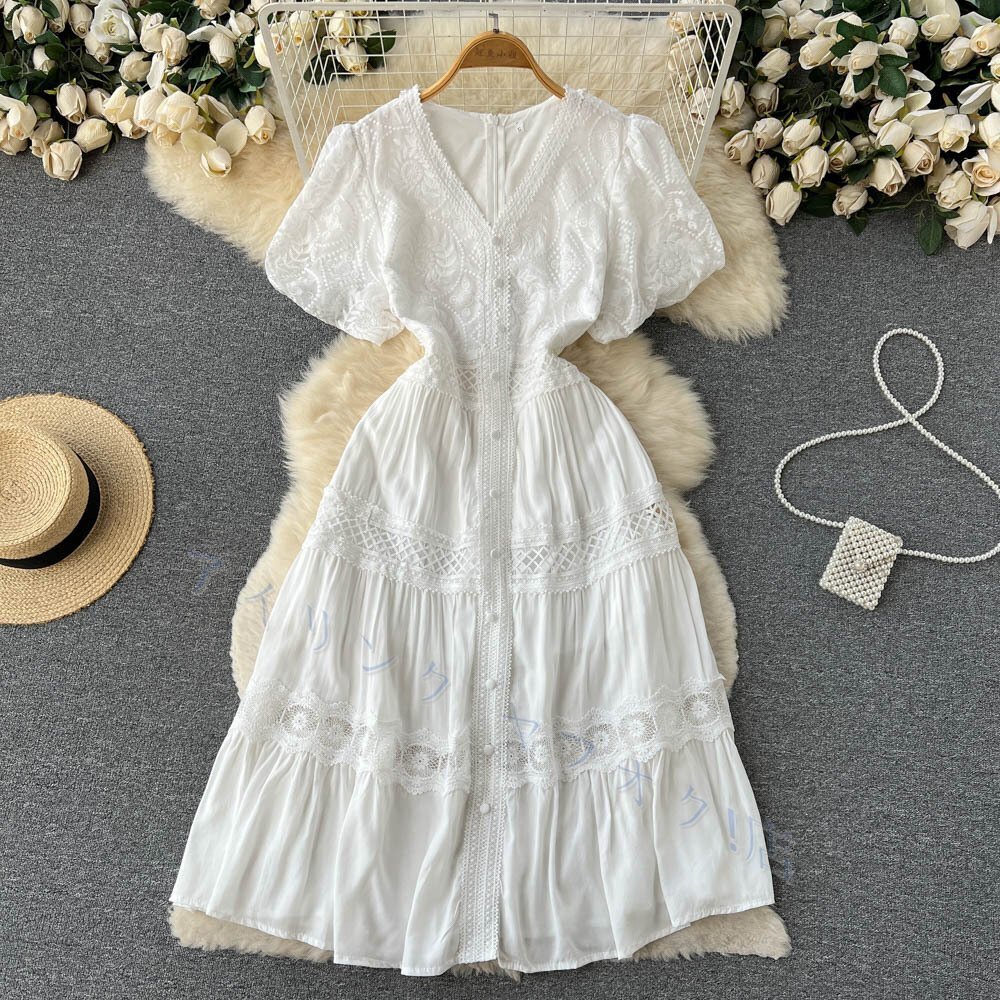 - 新品ワンピース レディース ロングドレス 華やかな花柄 総レース 刺繍 前開き ランタンスリーブ ナチュラル 半袖 Vネック 女らしい 春夏 XL