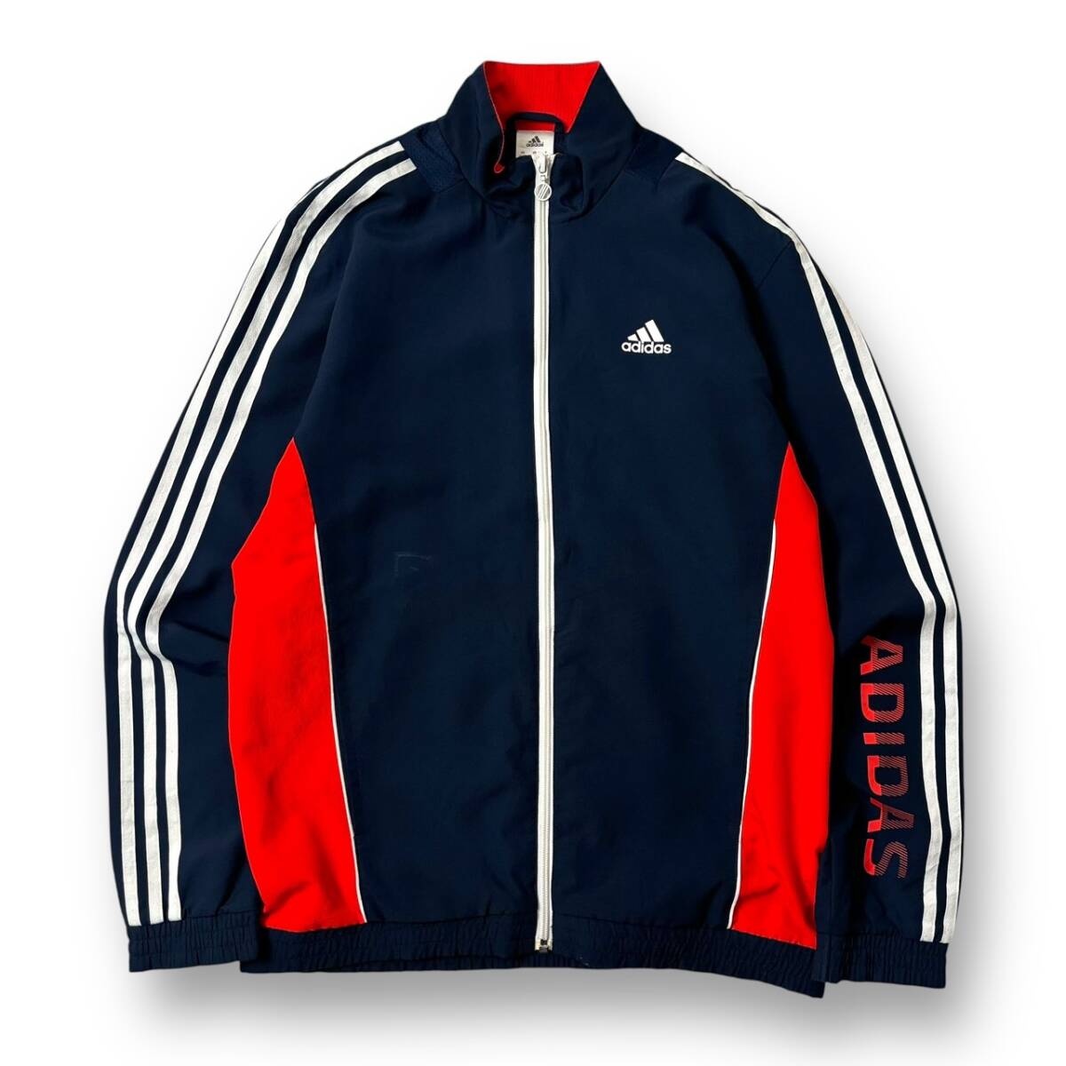 - M 古着 adidas アディダス 袖ライン サイドライン スリーライン ナイロンジャケット ウインドブレーカー 袖ロゴ 紺 赤 ネイビー レッド