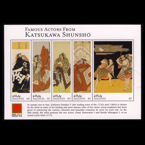 - ■モルジブ切手 勝川春章 浮世絵 / 歌舞伎 日本国際切手展 5種シート