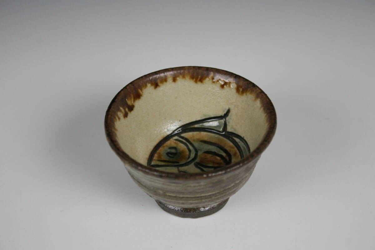 - 壺屋焼 人間国宝 金城次郎 作 外刷毛目魚文ぐい呑
