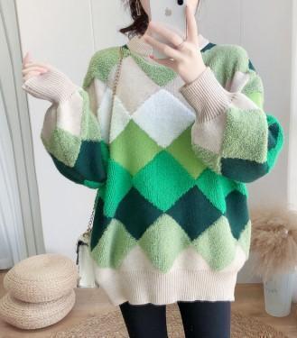 - 【グリーン色★2XLサイズ】長袖ニットセーターダイヤ柄秋冬大きいサイズ
