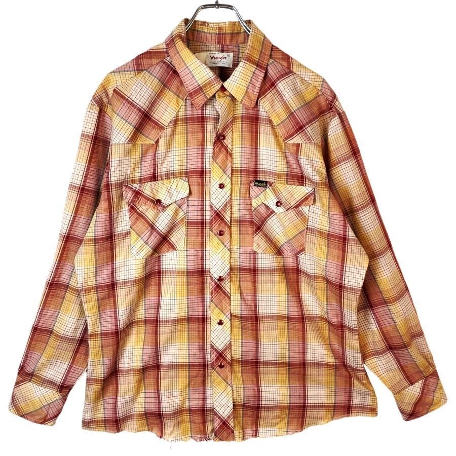 > USA製ラングラーWranglerウエスタンシャツ長袖チェックシャツ白ホワイト黄色イエロー赤レッドスナップボタンvintageヴィンテージ40917