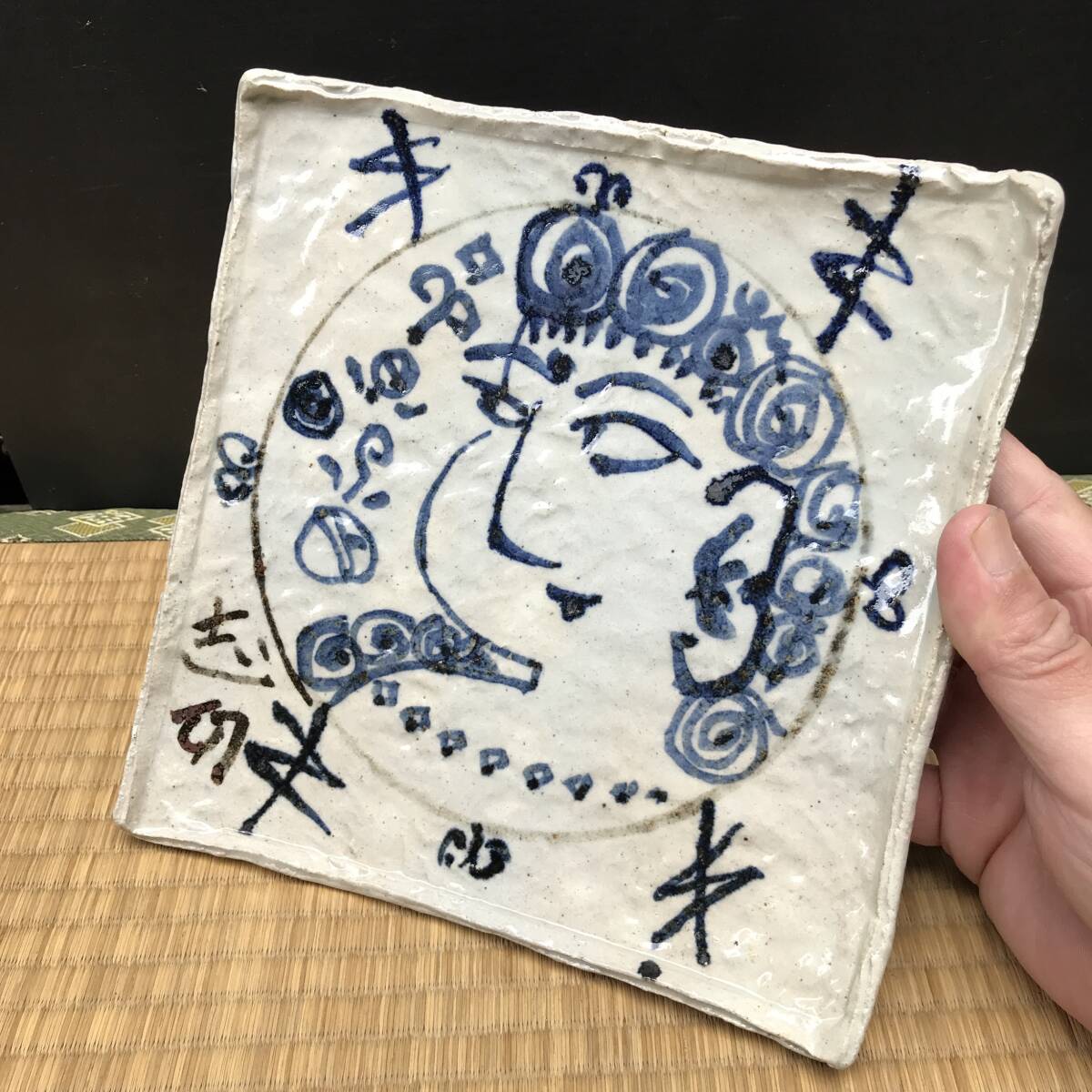 > (ロ)魯山人銘印?の四方皿、絵付け棟方志功合作?絵皿 角皿 飾皿 菓子皿 珍味入れ(R61119_D)