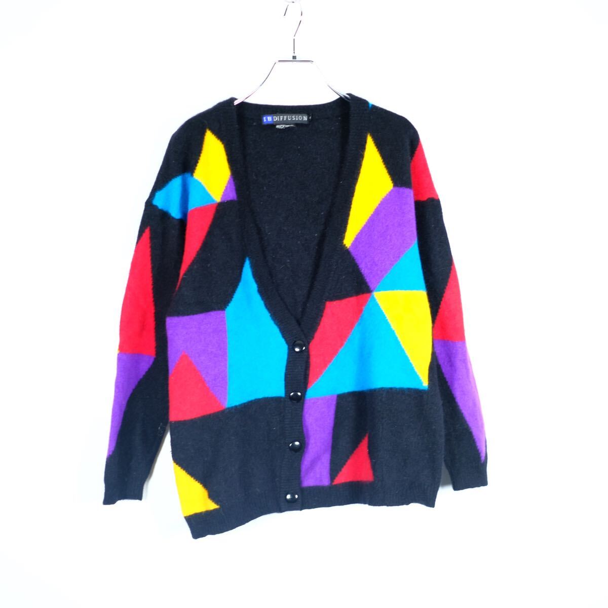 - 1990sビンテージ ラムウール デザインニットカーディガン カラフル アート ヴィンテージ 古着屋 幾何学模様