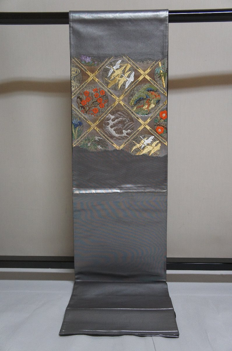 > 特選『紫紘』黒色銀箔地格天井琳派丸文袋帯[O15680]