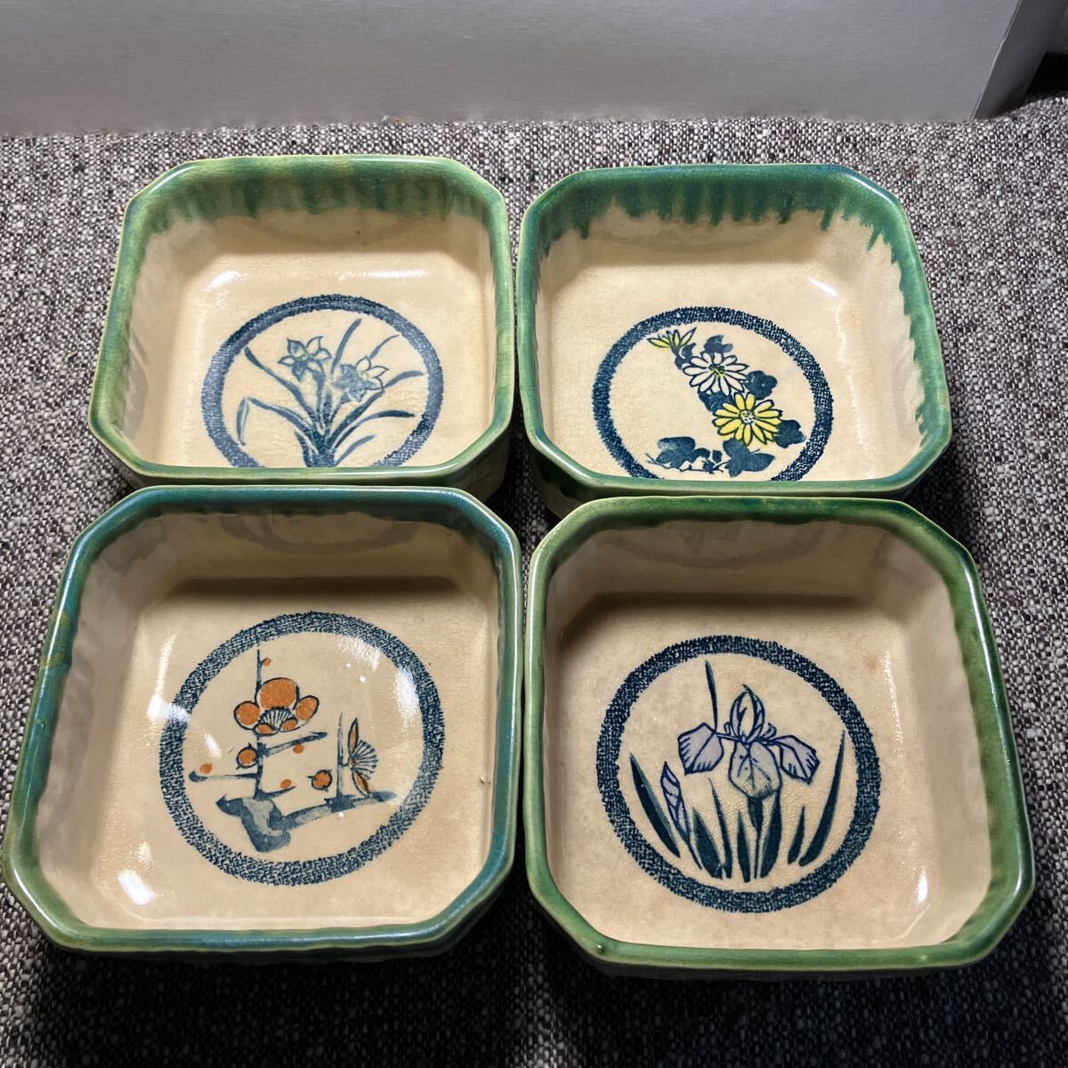 - 美濃焼 織部焼 梅柄 あやめ柄 四個 陶器 食器 角皿 小鉢 角皿