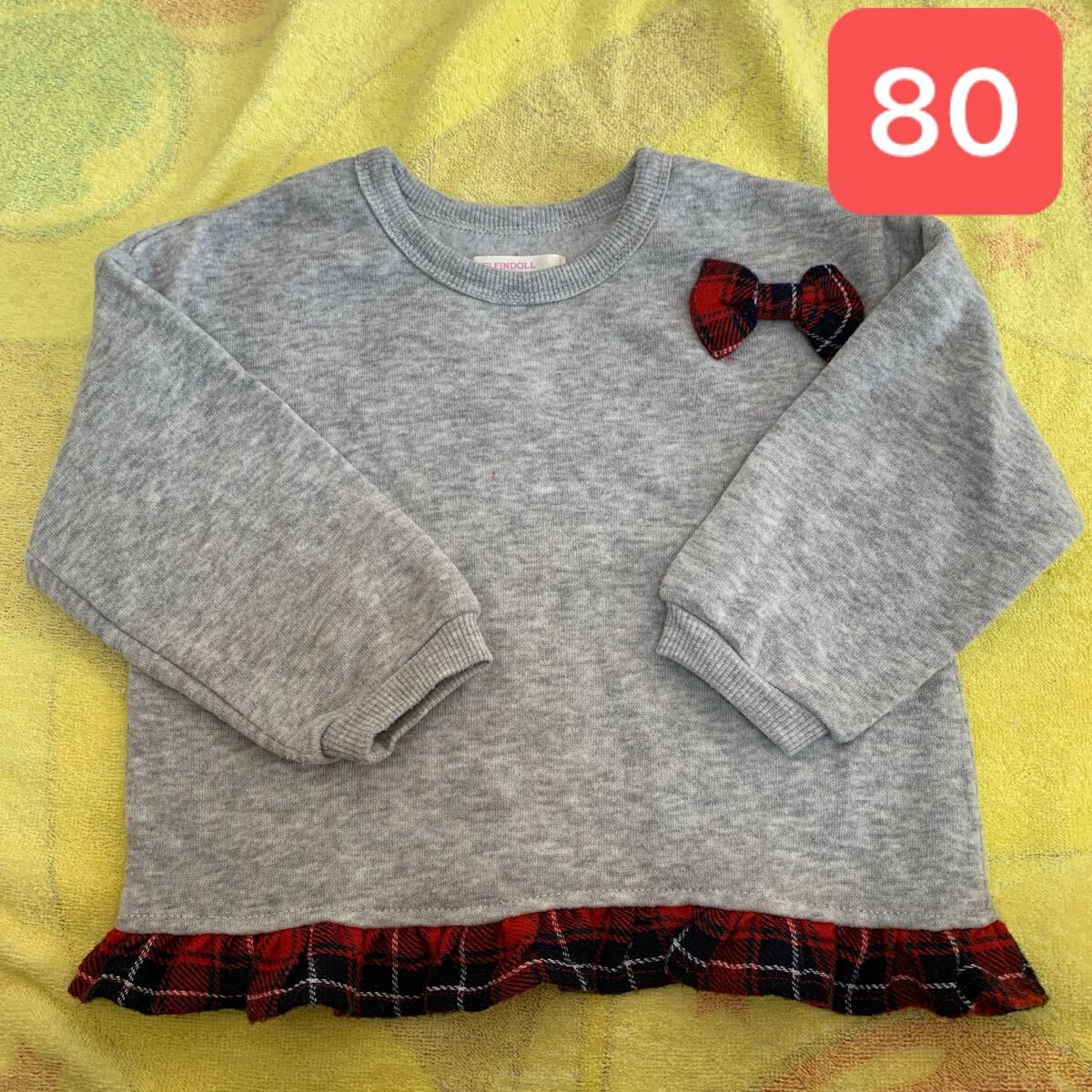 - 裏起毛 レッド チェック フリルリボン グレー 長袖 トレーナー 80