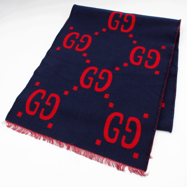 - グッチ GUCCI GG柄ウールマフラー ネイビー レッド
