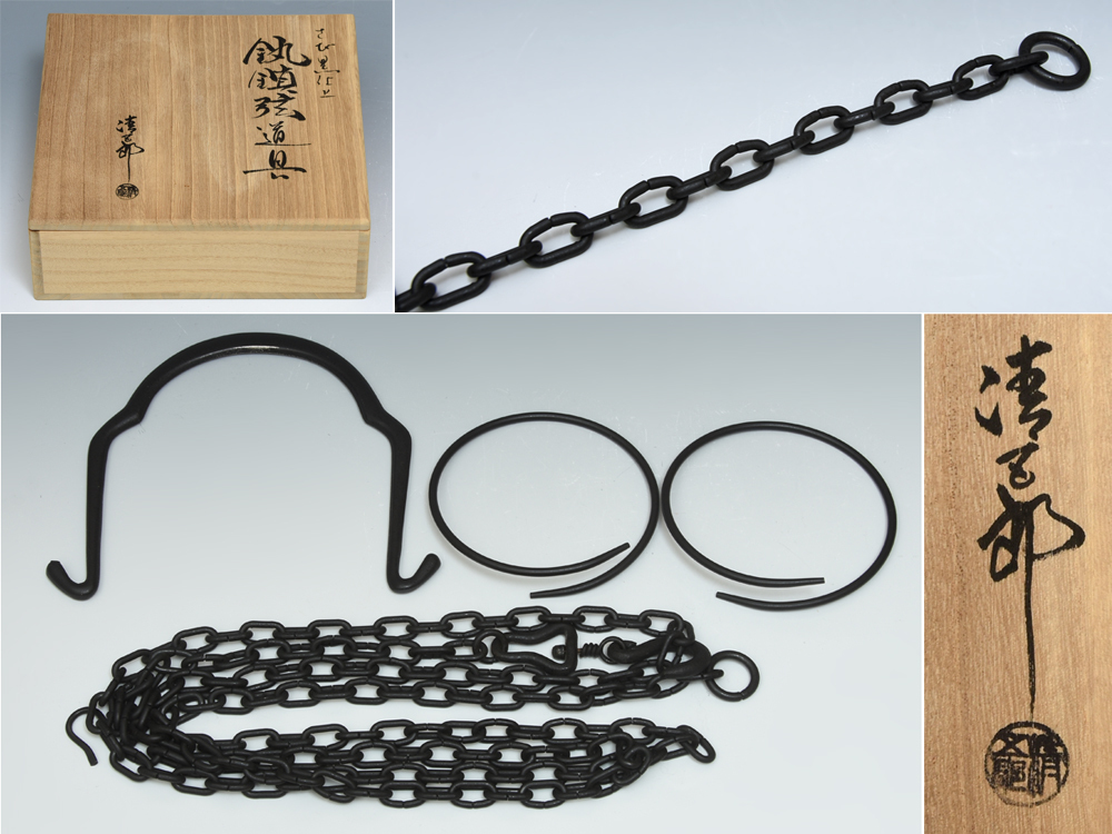 - 二代 木村清五郎(造)さび黒仕上げ 鐶 鎖 弦 道具三点セット 一式 共箱 茶道具 金属工芸 釜道具 釣釜 z9129o