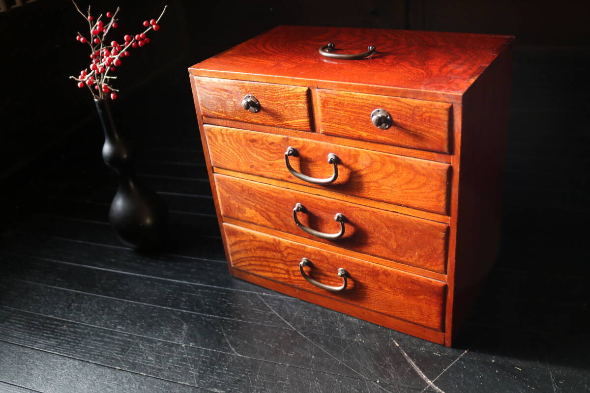 - 【伊董】B195.アンティーク!レトロ!上手!古い小抽斗欅の杢目が美しい針箱化粧箱総欅中桐明治~大正小抽斗小引出し #古民藝 #古道具