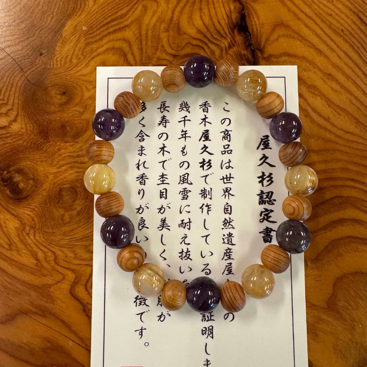 - 屋久杉ブレスレット6mm塗装12玉+ルチル7mm6玉+アメジスト7mm6玉 内周約14.5cm 送料無料