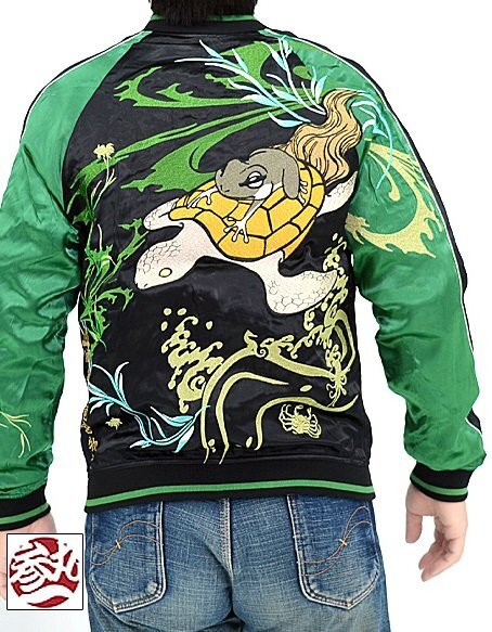 > 浦島蛙遊覧スカジャン◆参丸一 ブラック×グリーンXXLサイズ SM-30618 和柄 和風 刺繍 スーベニアジャケット カエル