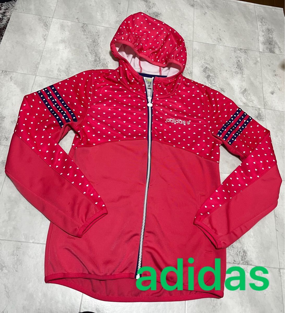 > アディダス adidas ネオ フード付ジップアップパーカー ジャージ ロゴ刺繍 ハート柄 ピンク Mサイズ