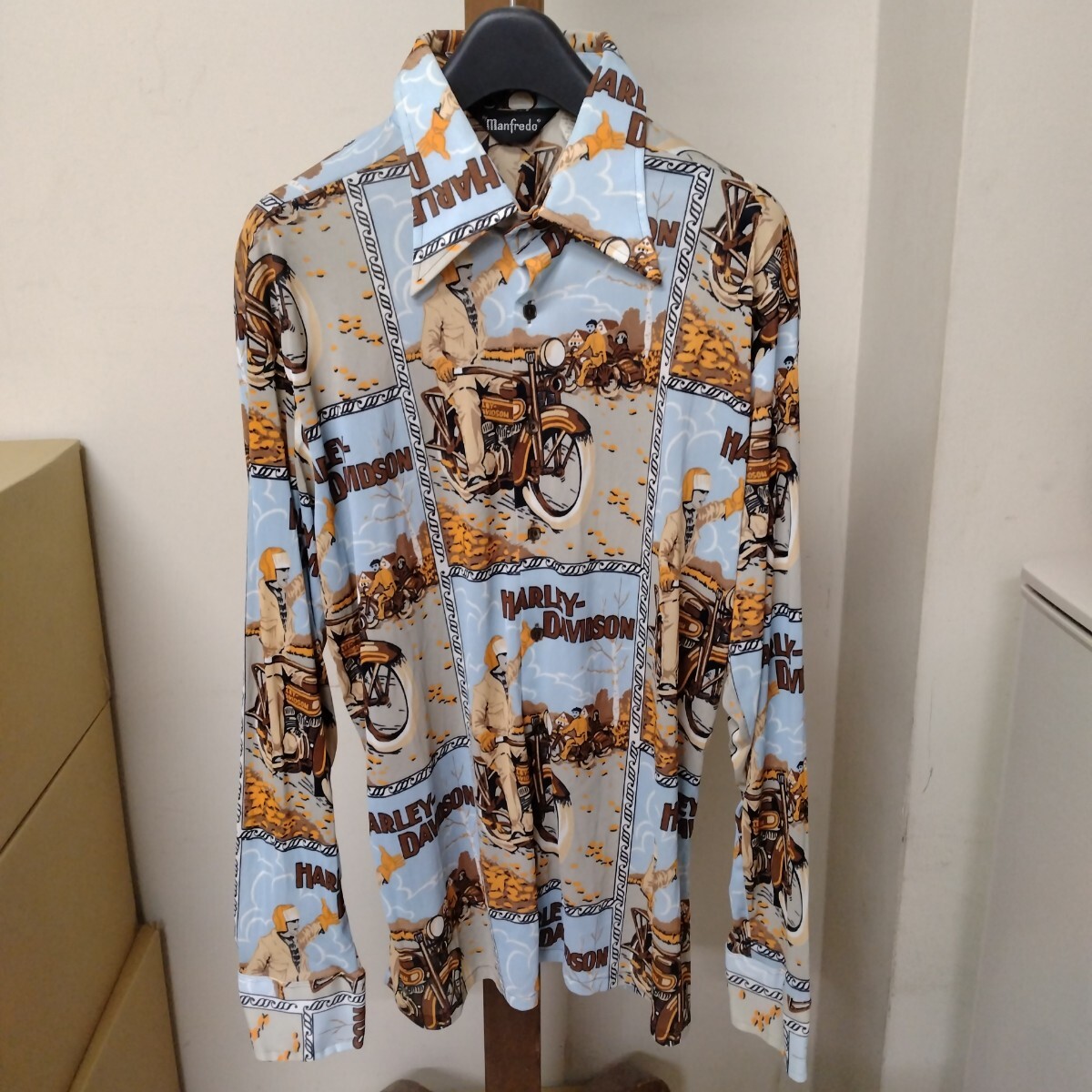 > Manfredo HARLEYDAVIDSON 総柄ポリエステルシャツ ポリシャツ 70's ハーレーダビッドソン