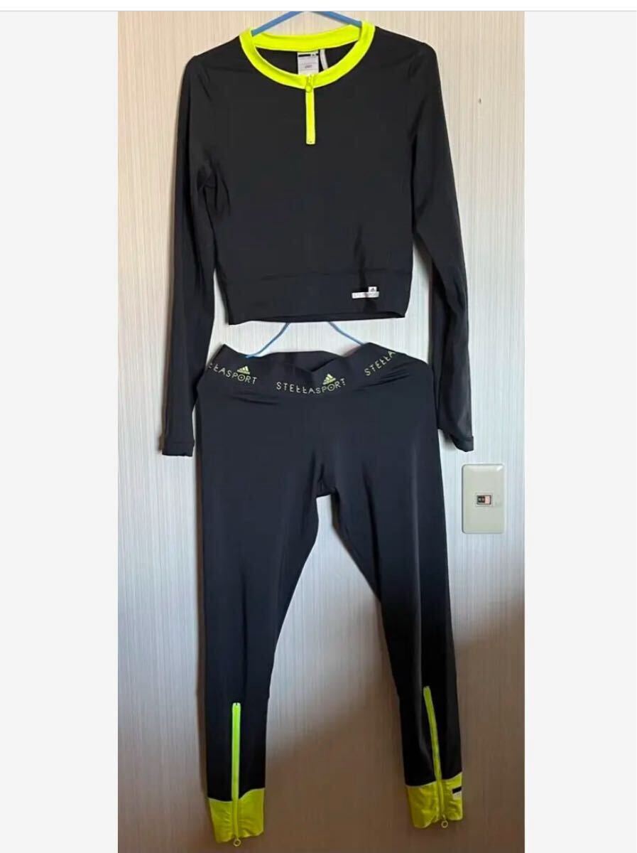 - ◆アディダス◆StellaSport◆長袖シャツ&タイツセット◆レディース◆黒、蛍光グリーン、LL◆中古◆トレーニング◆エクササイズ用◆激レア