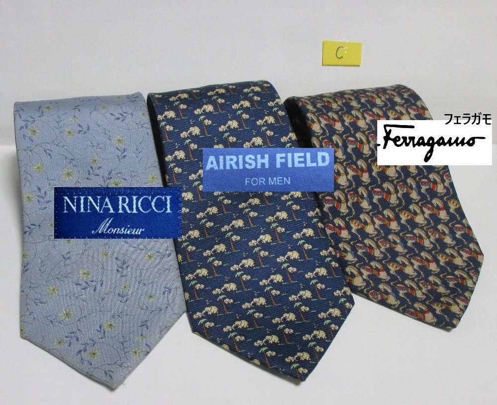 - C▲ 紳士・シルク・ネクタイ 3本 海外ブランド(イタリア フランス アイルランド)フェラガモ ニナリッチ など