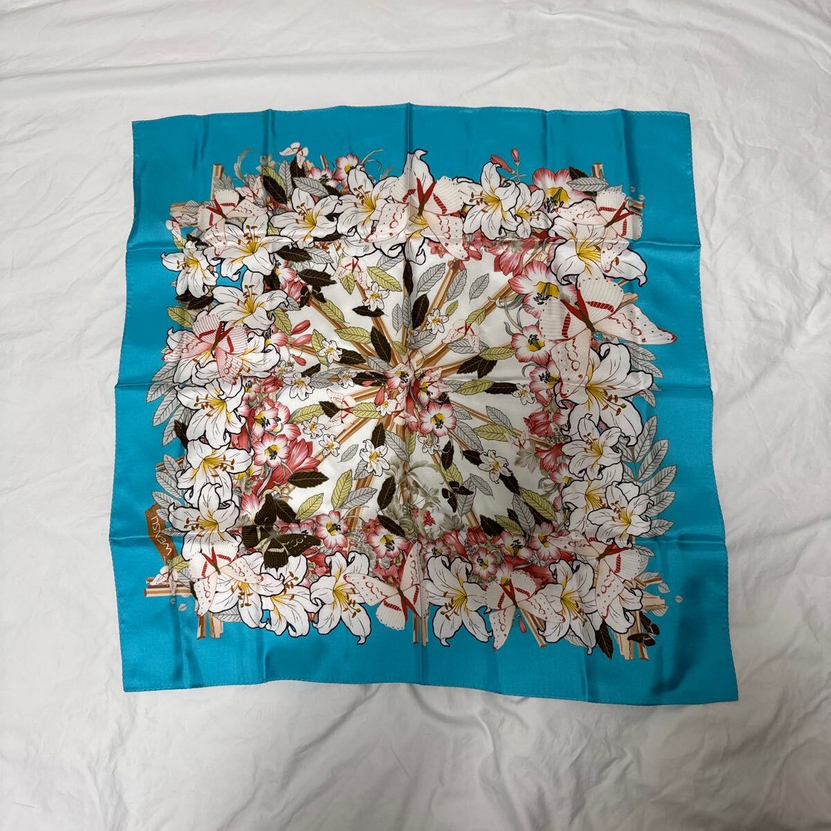 - 新品 タグ付スカーフ シルク100% SILK 絹 水色 花柄 フラワー おしゃれ ストール 百合
