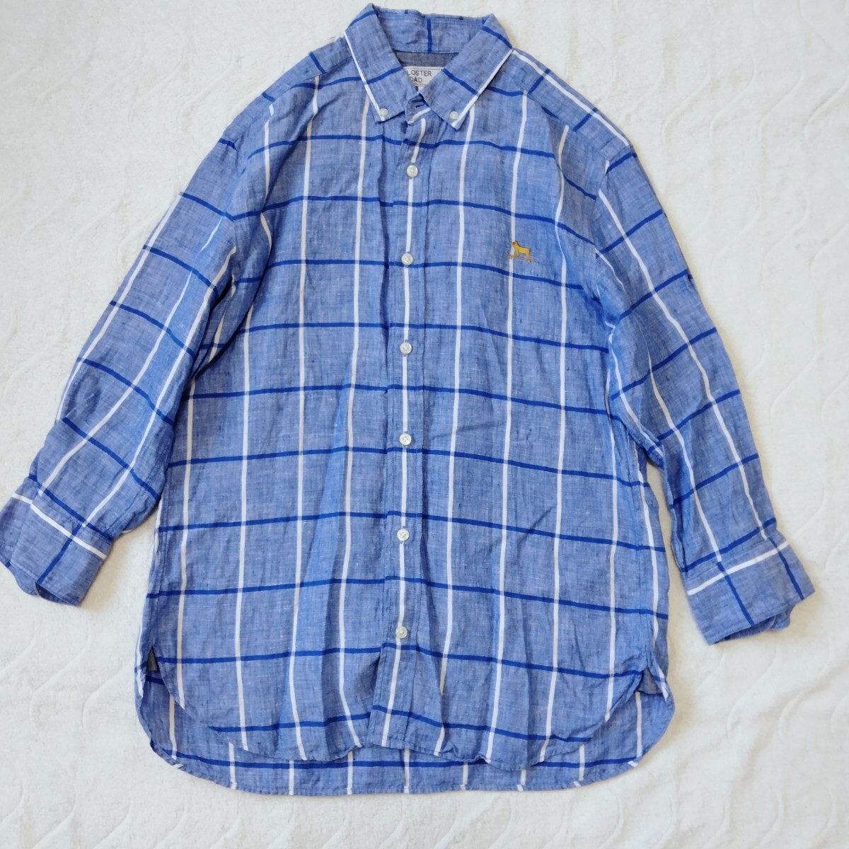 > GLOSTER ROAD*グロスター*リネン100%*麻*フレンチブルドッグ刺繍*七分袖*メンズL*シャツ*チェック柄*青系*犬