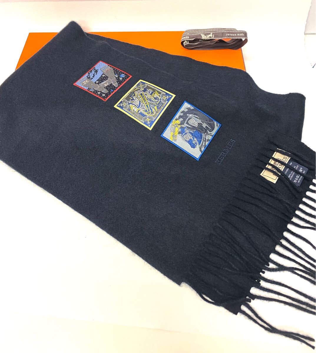 > 新品・現行品 定価97,900円 HERMES エルメス バッジ・ソア カシミア マフラー ストール ワッペン フリンジ メンズ イギリス製 箱