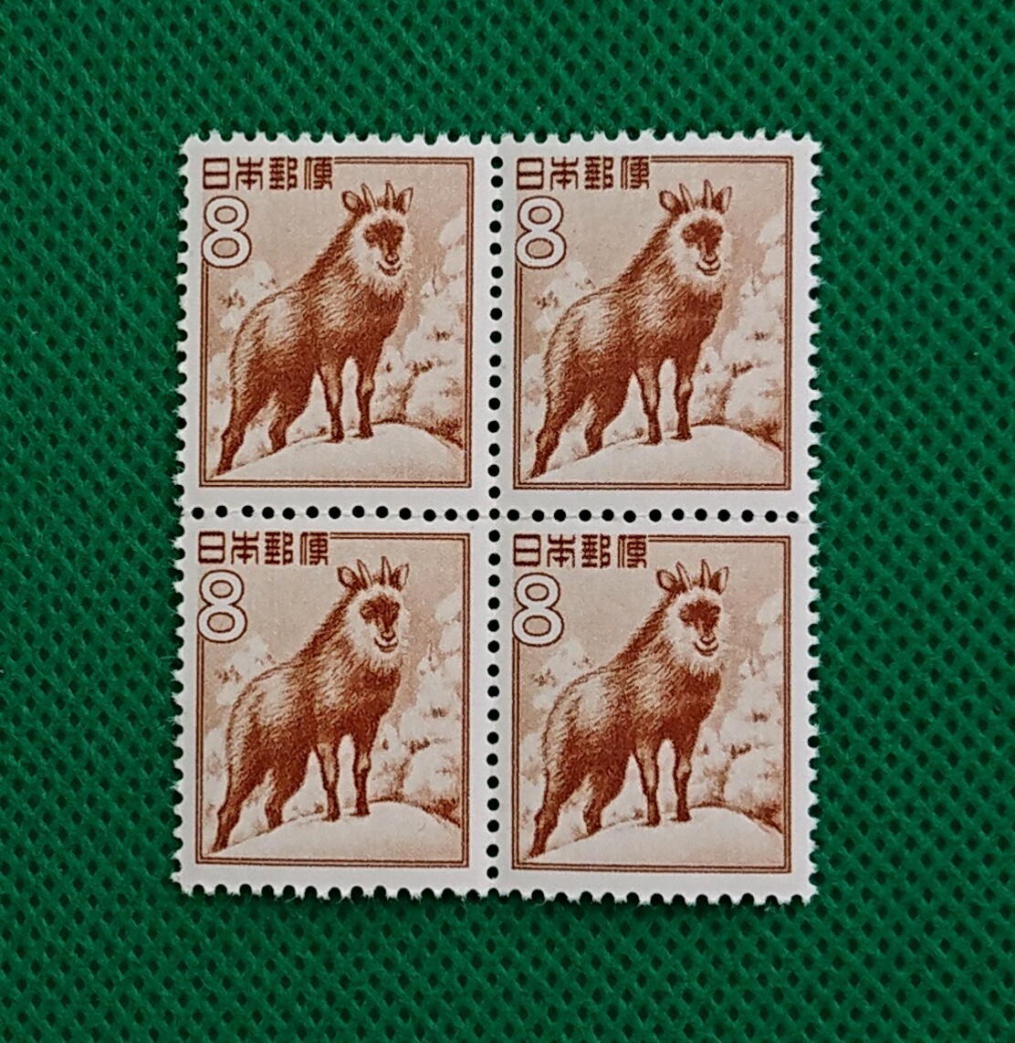- 観音エンボス/裏観音/かもしか/8円/4枚ブロック/第1次円単位/希少品/未使用/NH/極上美品/裏糊良好/1955年/動植物国宝図案/普通切手/No145
