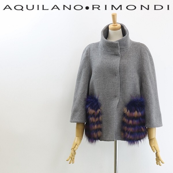 - ◆AQUILANO RIMONDI アキラーノ リモンディ フォックスファーポケット ウール 切替 七分袖 中綿 ショート コート グレー 40