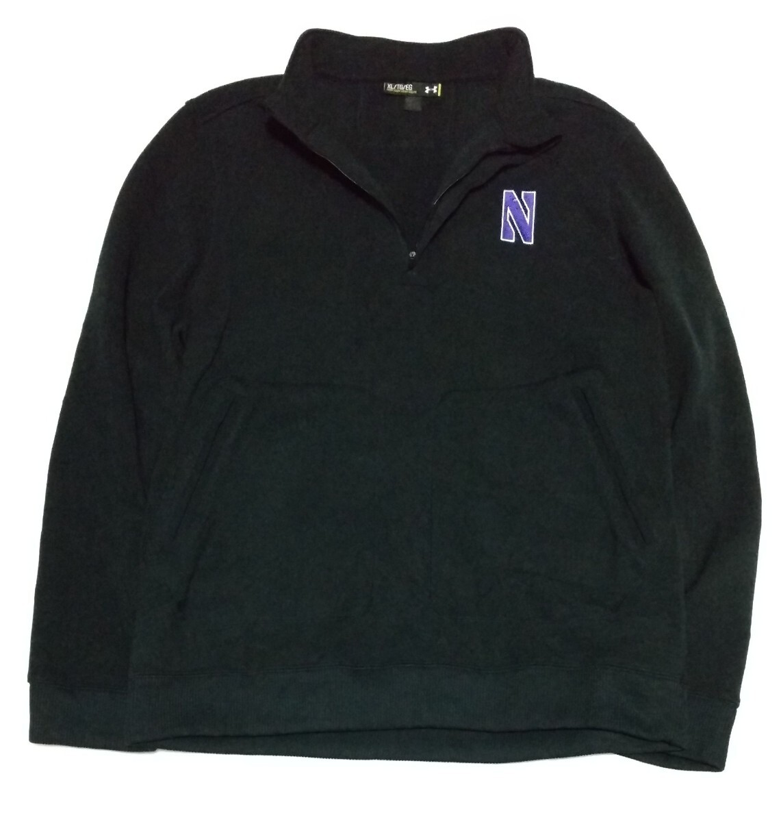 > UNDER ARMOUR サイズXLハーフジップ長袖フリースLOOSEスウェット黒ブラック紫色Nスポーツ刺繍白ファッション洗濯済ウェア アンダーアーマー