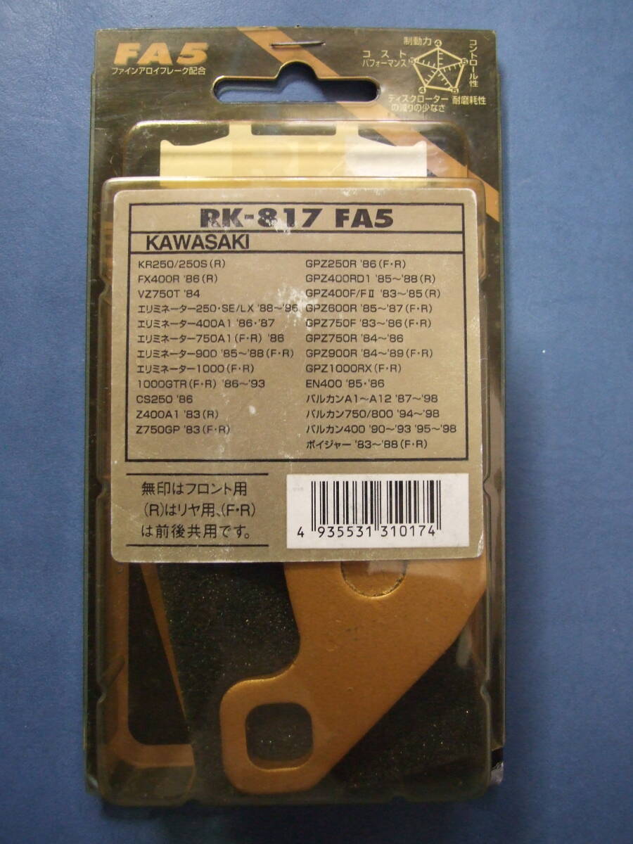 - わけあり未使用品:RKブレーキパット セミメタルパット ファインアロイ55 RK-817FA5 フロント/リヤ GPZ エリミ EN FX VZ バルカン他.