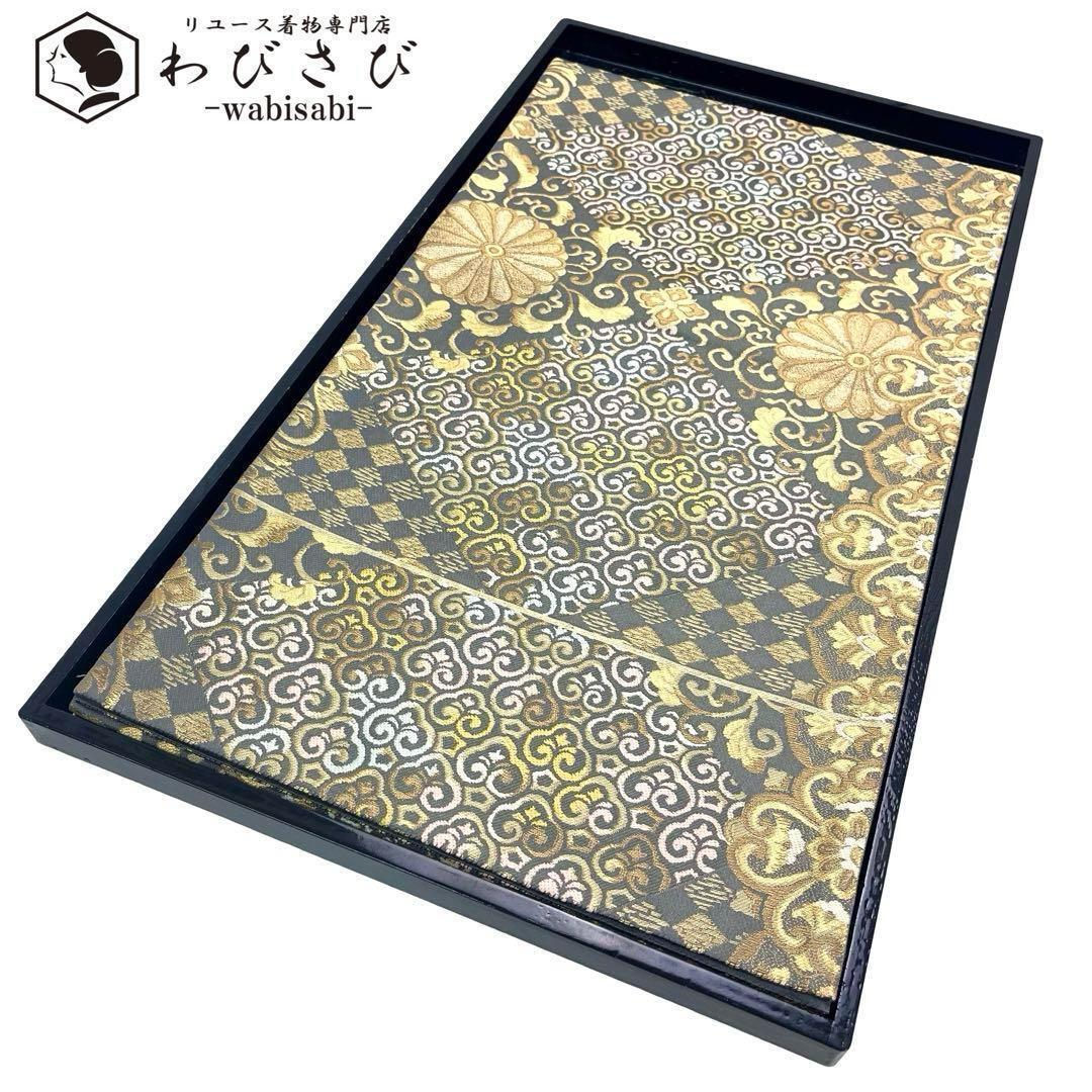 - 袋帯 斜め市松柄に華柄模様 薄黒色 金糸 O-3856 着物 きもの kimono 和服 和装 中古 リサイクル着物 【送料無料】