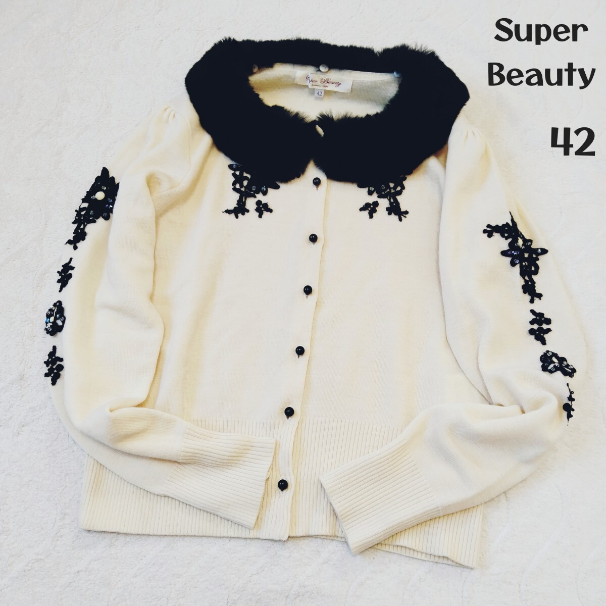- SuperBeauty*スーパービューティー*42サイズ*リアルファー付きカーディガン*ビジュ―*ビーズ刺繍*オフホワイト*おでかけ*華やか