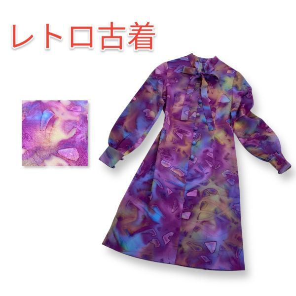 - 【レア】昭和レトロ ワンピース サイケ 総柄 パープル系 透け感 ヴィンテージ ゆったり エレガント オートクチュール 特注品 匿名配送