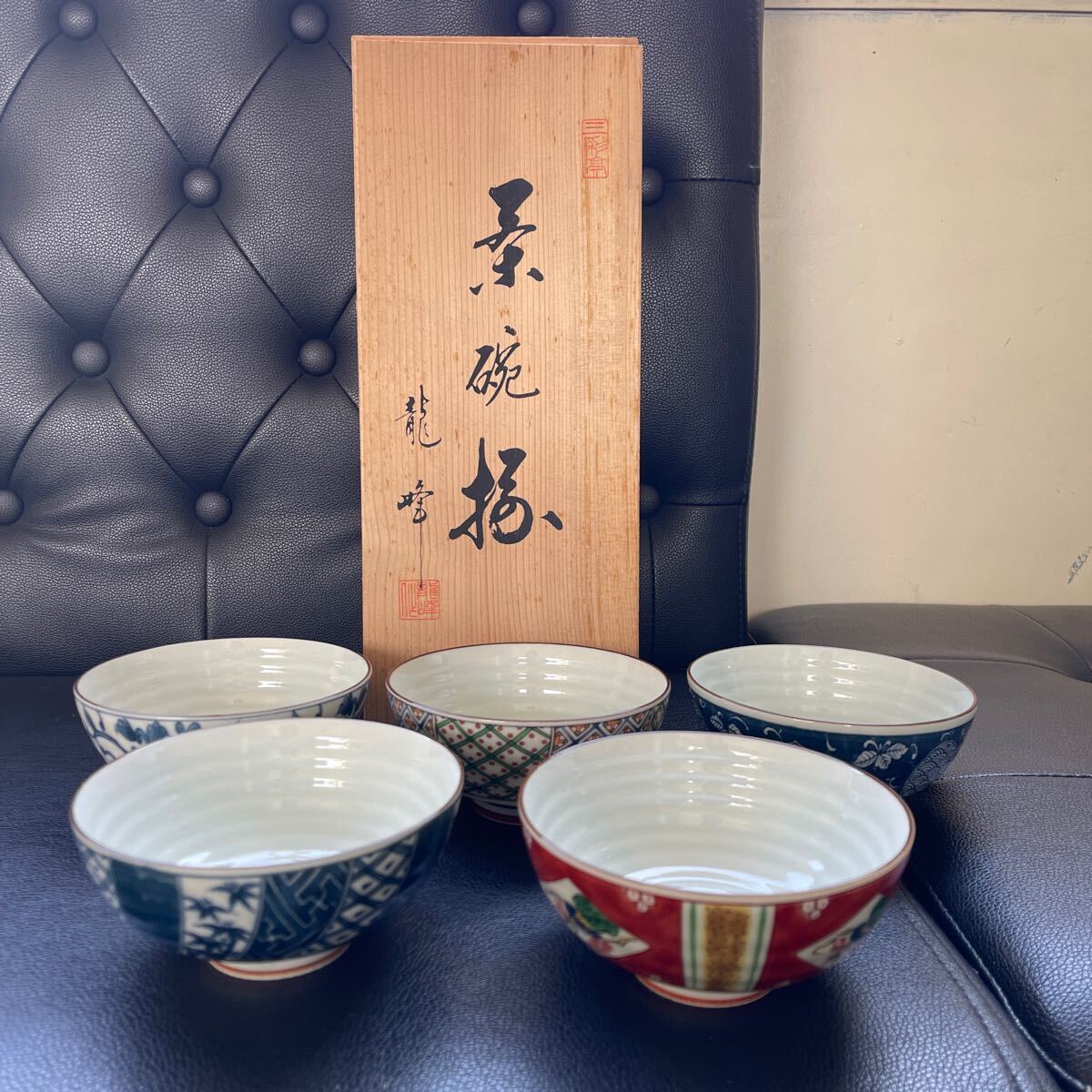 - 古染絵変り茶碗 龍峰窯 5客 三彩亭 茶碗 共箱 木箱