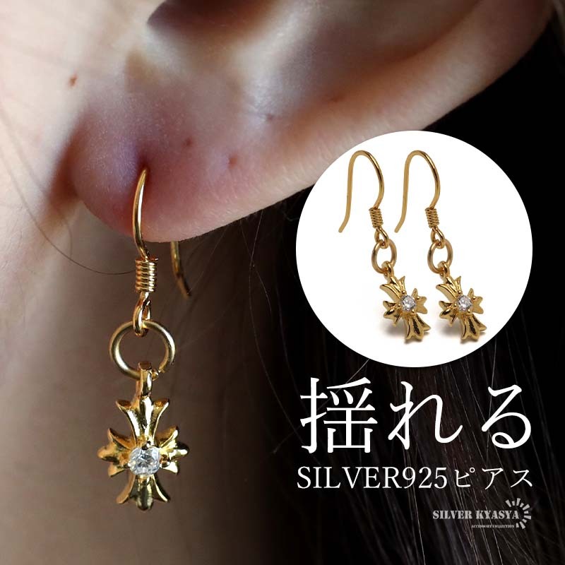 > シルバー925 クロスピアス フックピアス ドロップピアス 揺れる 小ぶり 18kgp レディース 女性 両耳2点 金アレ対応