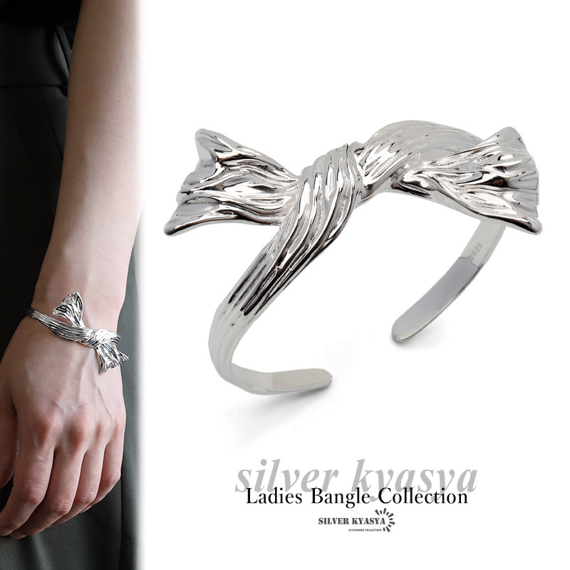 > リボンバングル シルバー925 立体的 リボン 大きめ レディース ブレスレット シルバー シンプル 大ぶり カジュアル 人気