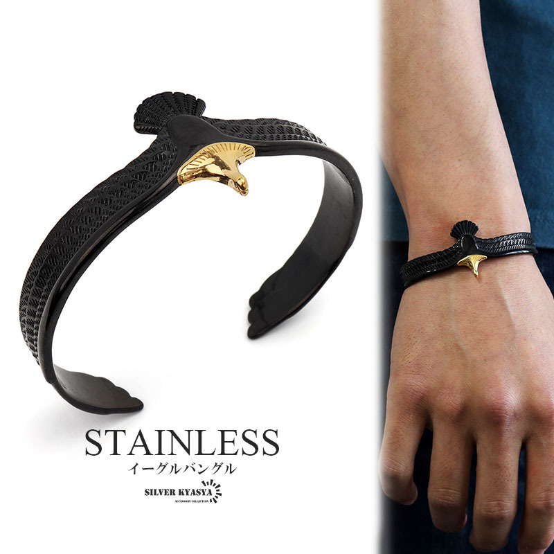 - ステンレス素材 イーグルバングル ブラック 黒 バングル 頭金イーグル フェザーバングル ブレスレット