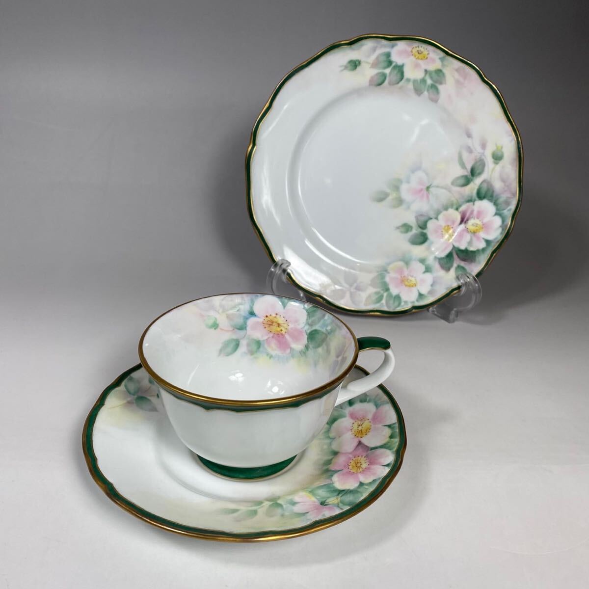 > ティーカップ トリオ カップ ソーサー プレート グリーン 金彩 花紋様 ハンドペイント 美術品 ケーキ皿 オールドニッポン調