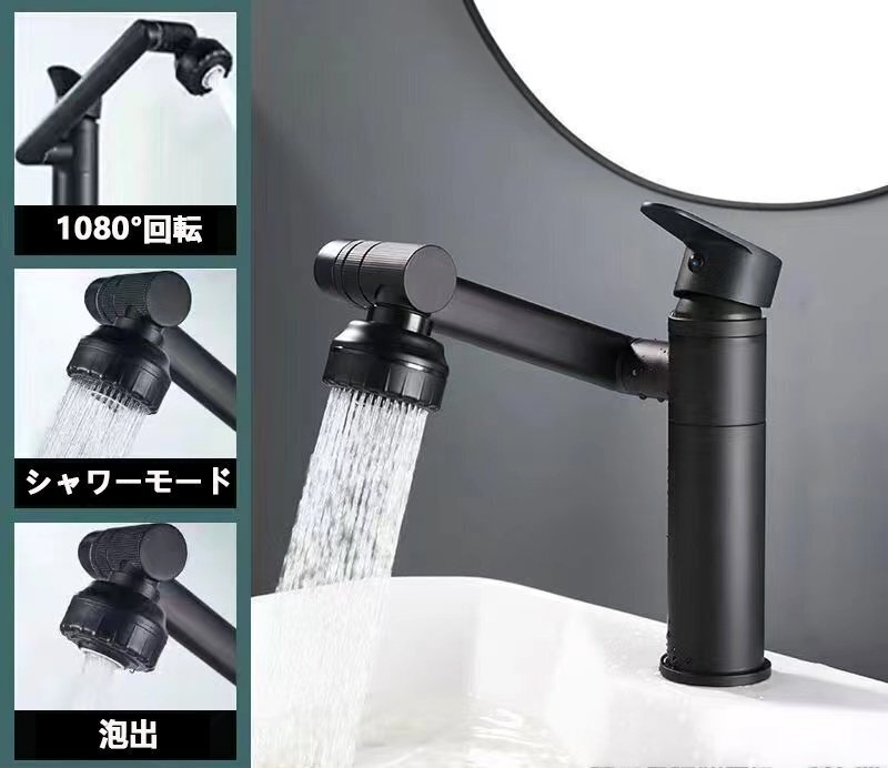 - 蛇口 混合水栓 1080°回転 冷熱水 上向き出水 左右変更 60cmホース付 トイレ シャワーモード 立水栓 洗面ボウル バス ブラック
