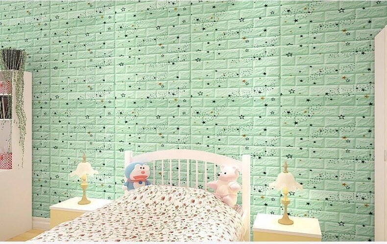 - 高品質 壁紙10枚 3Dウォールシール レンガ 防音 撥水加工 防カビ クッション 簡単リフォーム 星柄グリーン