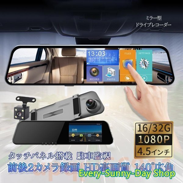 - ドライブレコーダー 前後カメラ 360度 ミラー型 前後同時録画 4.5インチ 16/32Gメモリカード 広角レンズ タッチパネル バックカメラ 1080P