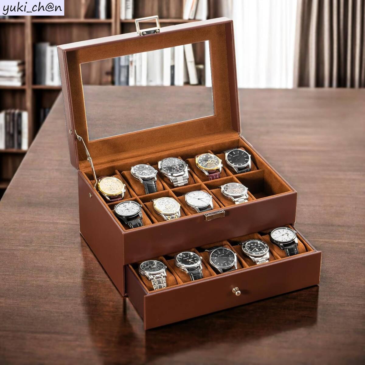 - 腕時計ケース 20本用 2段式 エスプレッソ PUレザー ウオッチボックス アクセサリー収納 ガラス天板 ディスプレイケース 小物
