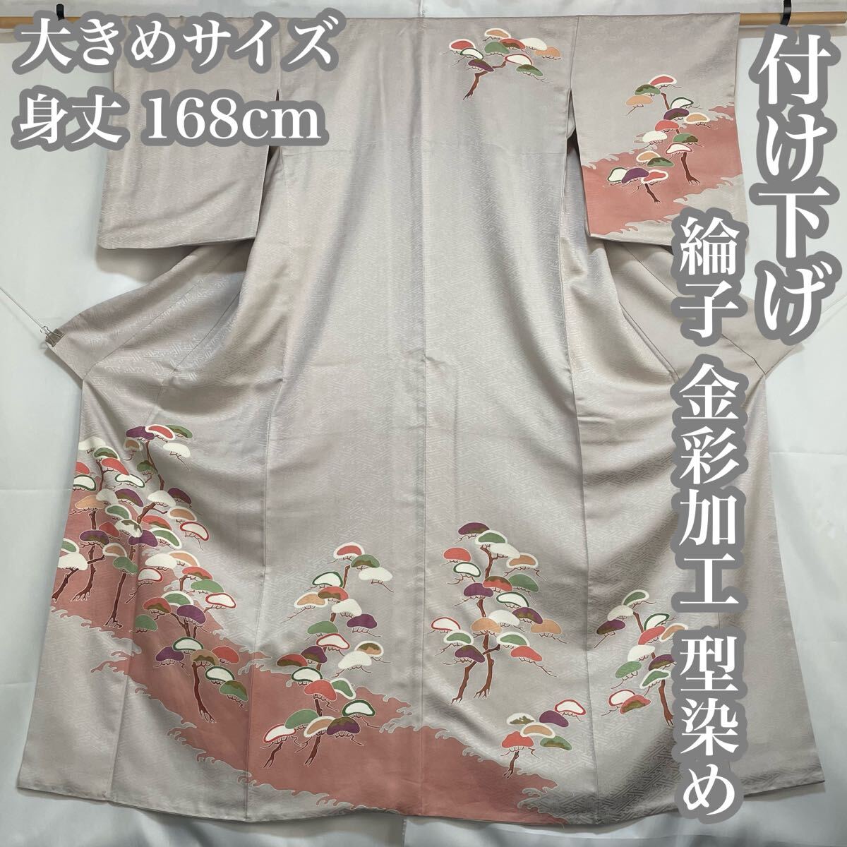 > #F060 大きめサイズ 付け下げ 綸子 金彩加工 松 型染め 比翼付き 正絹 身丈168cm 裄66cm 一つ紋 和装 和服 フォーマル 着物【wellriver】